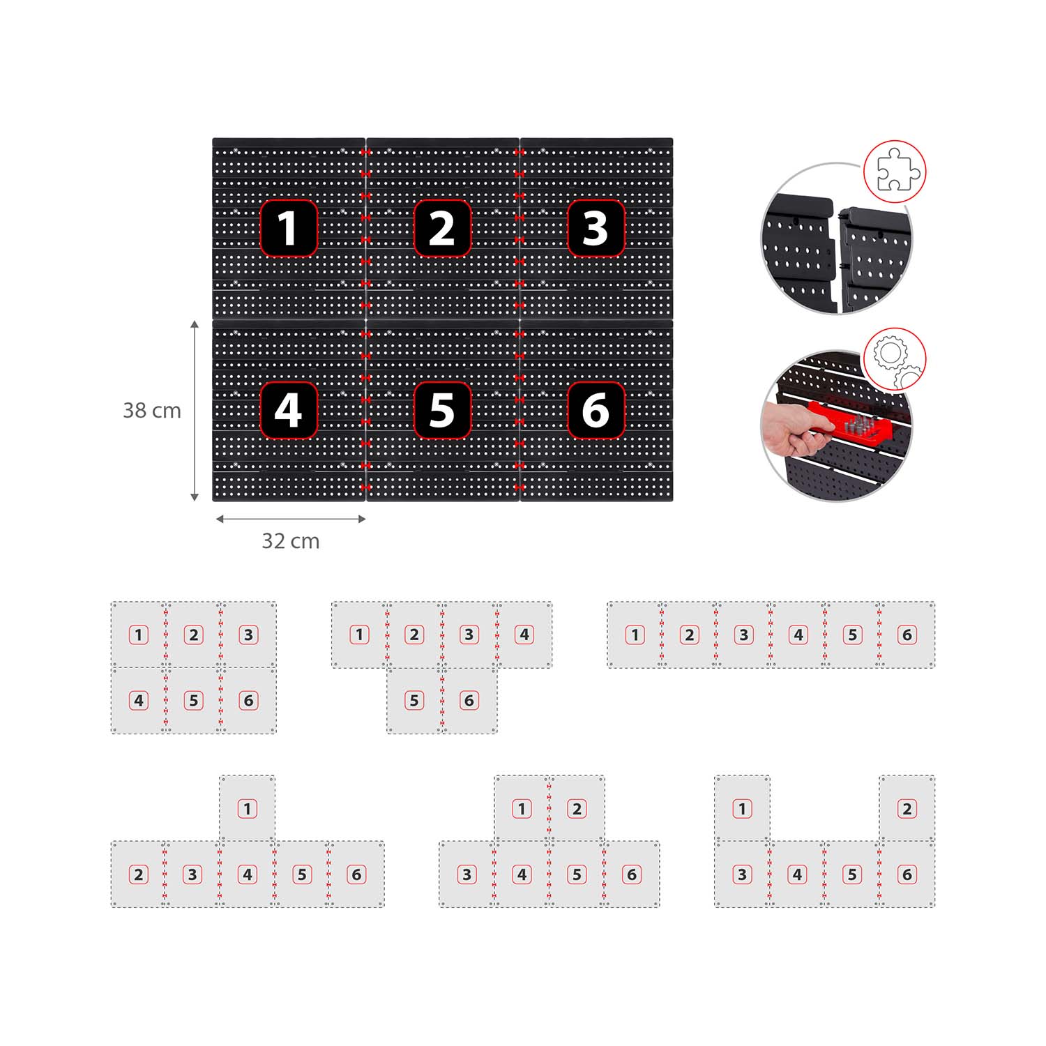 Tablica narzędziowa posiada modułową konstrukcję, dzięki której możesz dowolnie łączyć panele i dostosować układ do swoich potrzeb. Prosty montaż pozwala na szybkie i wygodne połączenie poszczególnych elementów, a różnorodne kombinacje zapewniają elastyczność w organizacji przestrzeni roboczej.