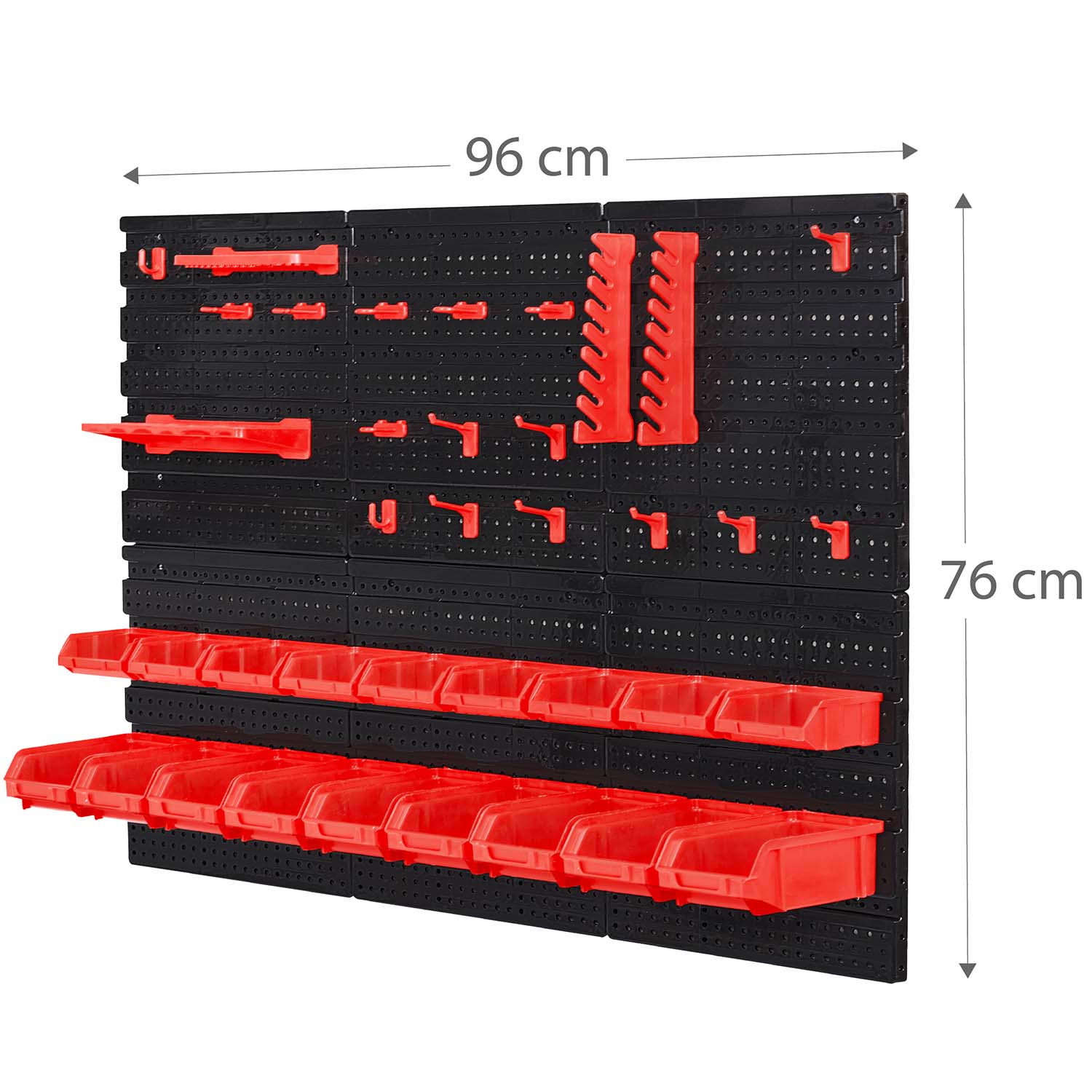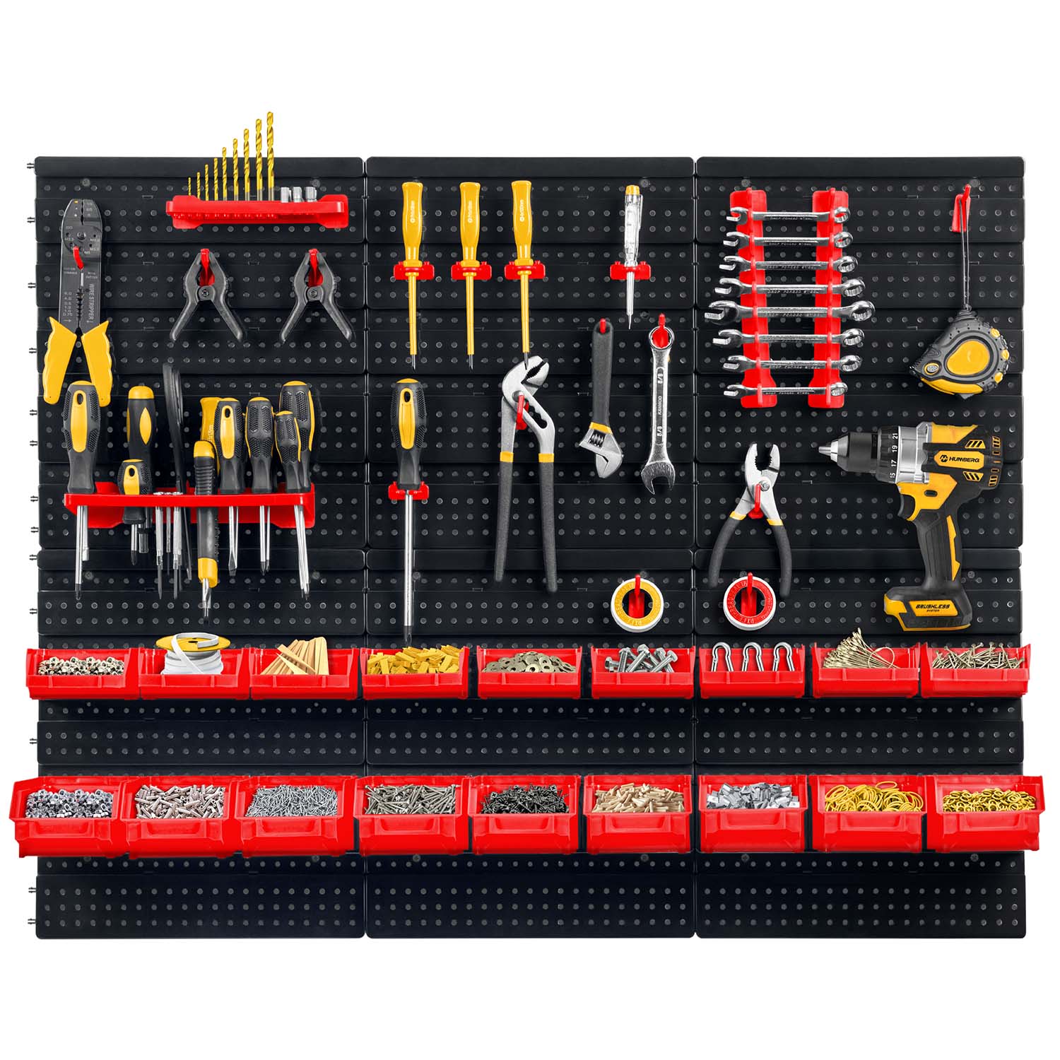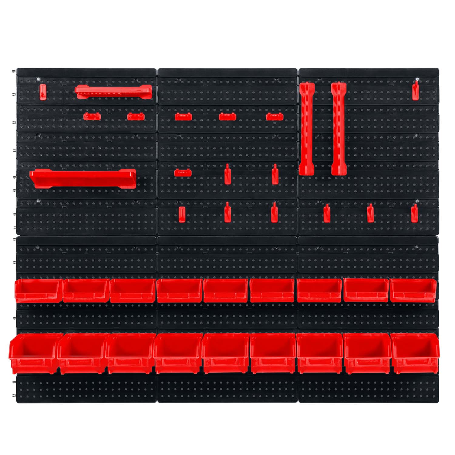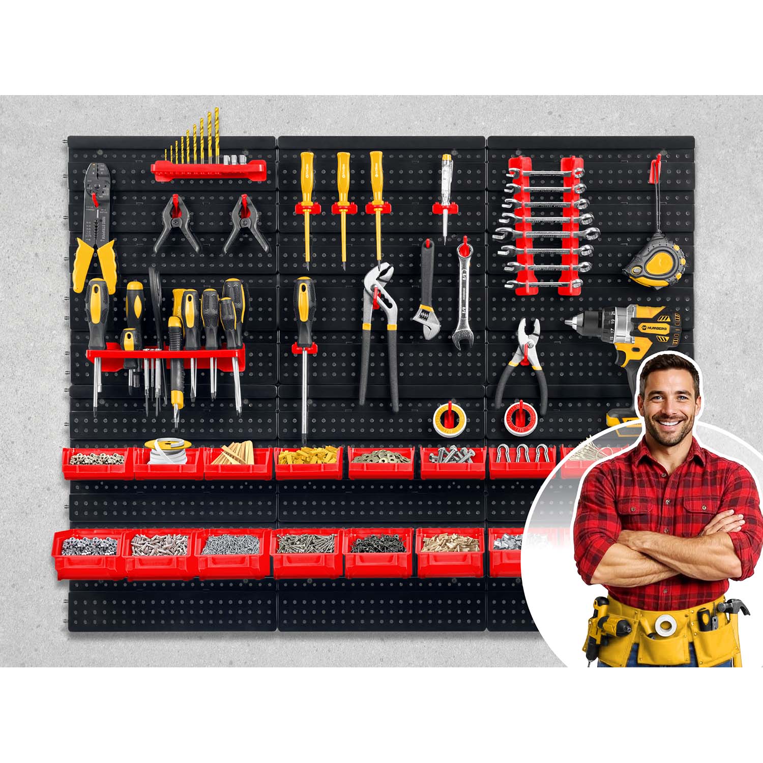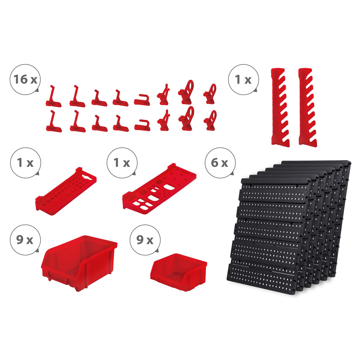Duży zestaw! 6 perforowanych paneli modułowych i aż 43 dodatkowe pojemniki, uchwyty, półki i haki.