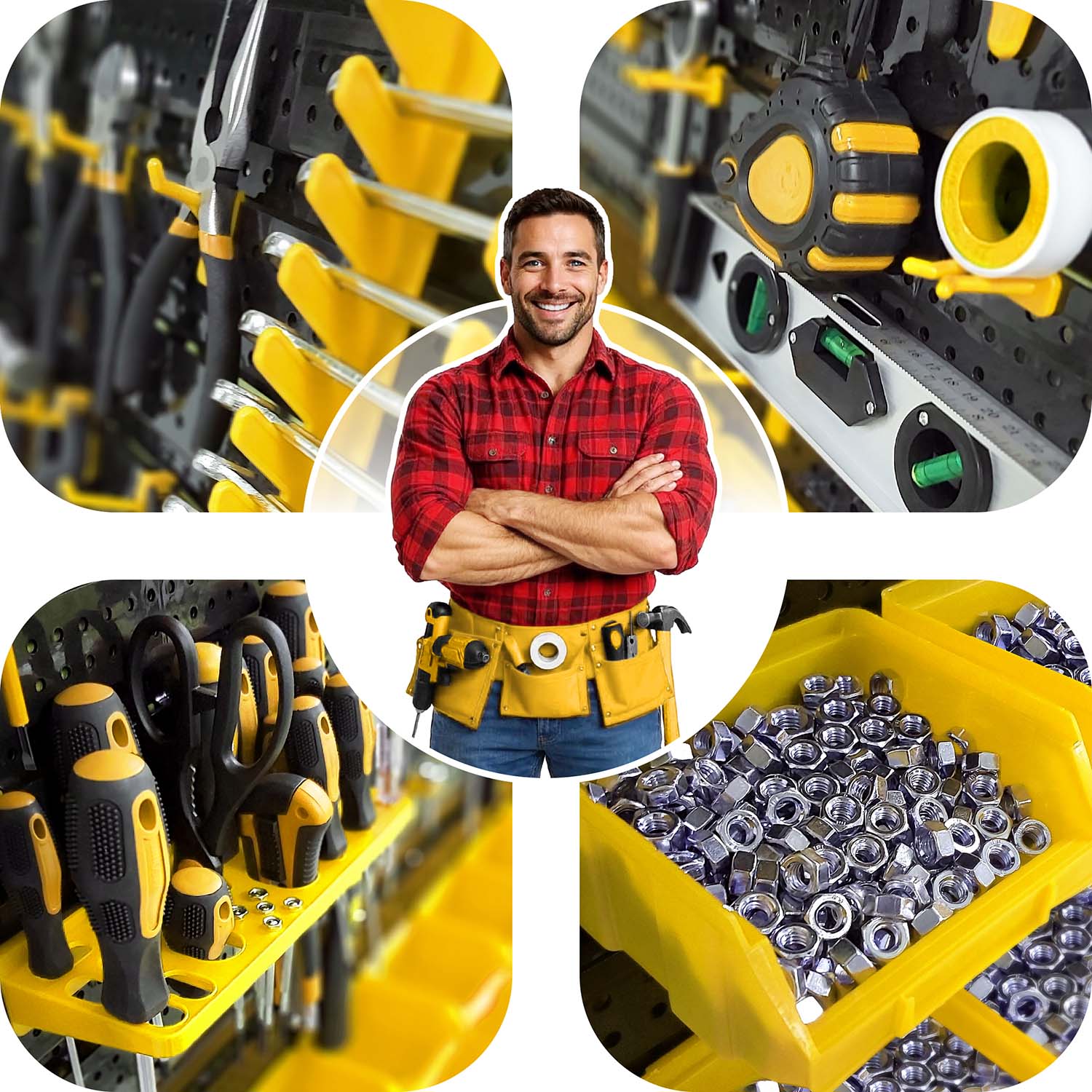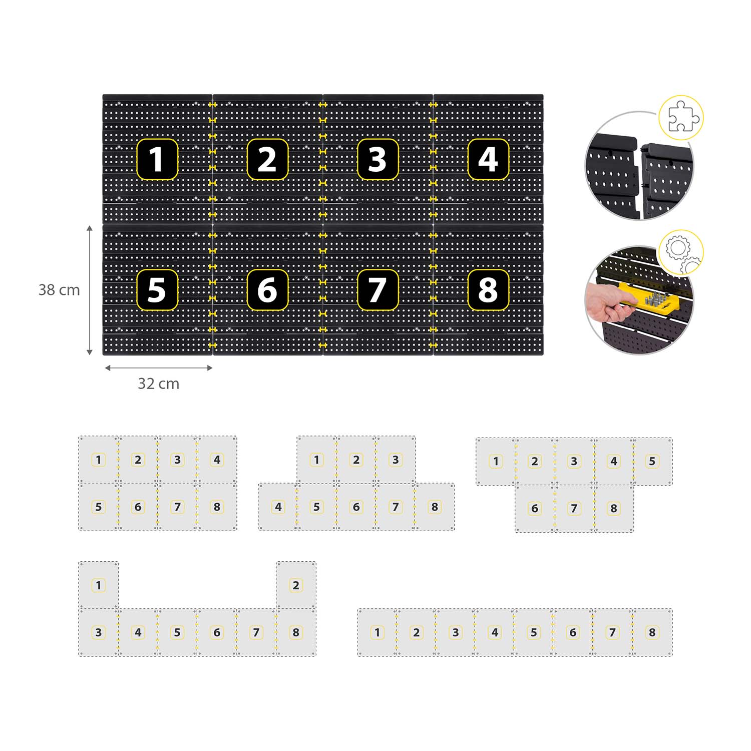 Tablica narzędziowa posiada modułową konstrukcję, dzięki której możesz dowolnie łączyć panele i dostosować układ do swoich potrzeb. Prosty montaż pozwala na szybkie i wygodne połączenie poszczególnych elementów, a różnorodne kombinacje zapewniają elastyczność w organizacji przestrzeni roboczej.