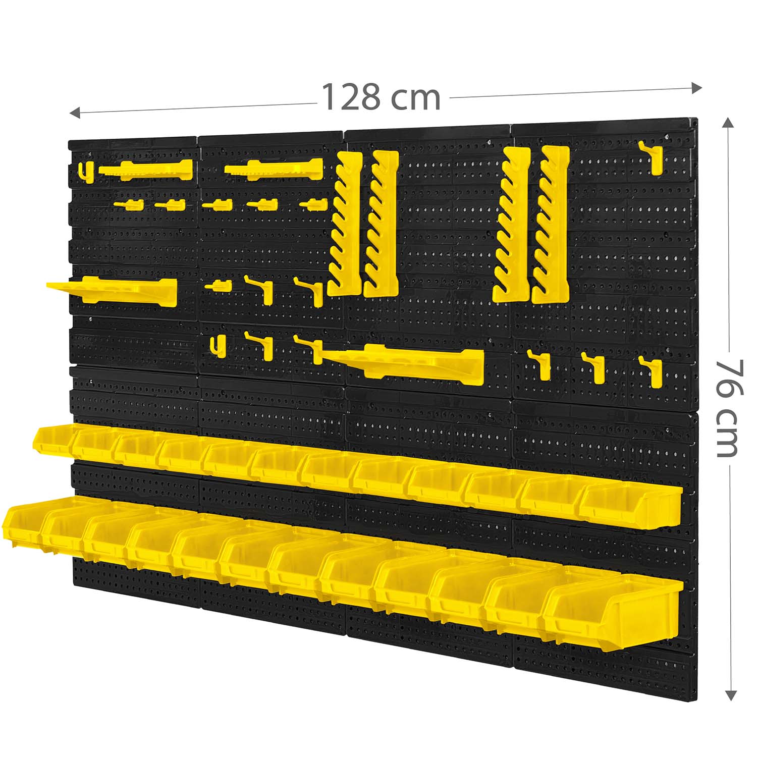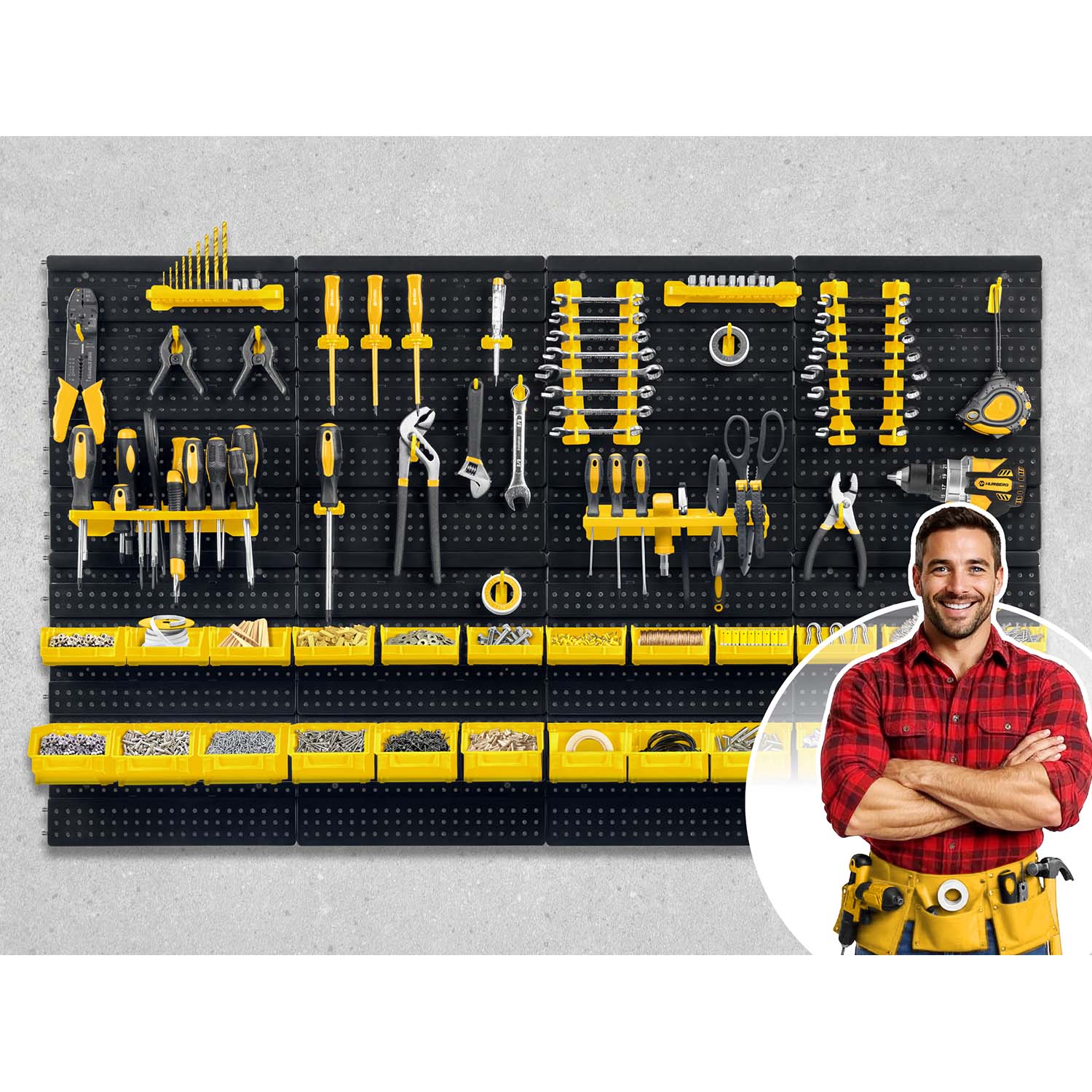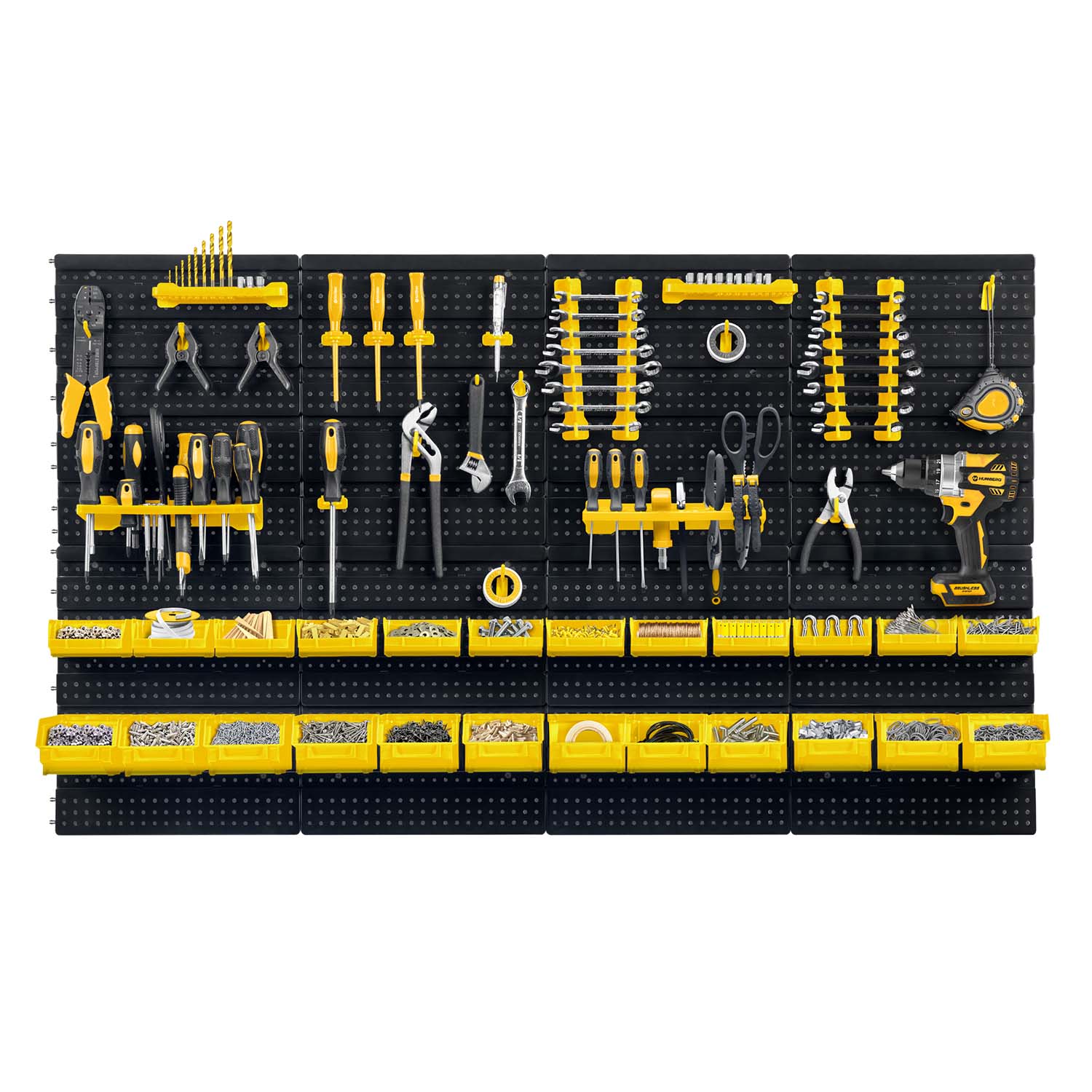 Duży zestaw! 6 perforowanych paneli modułowych i aż 54 dodatkowe pojemniki, uchwyty, półki i haki.
