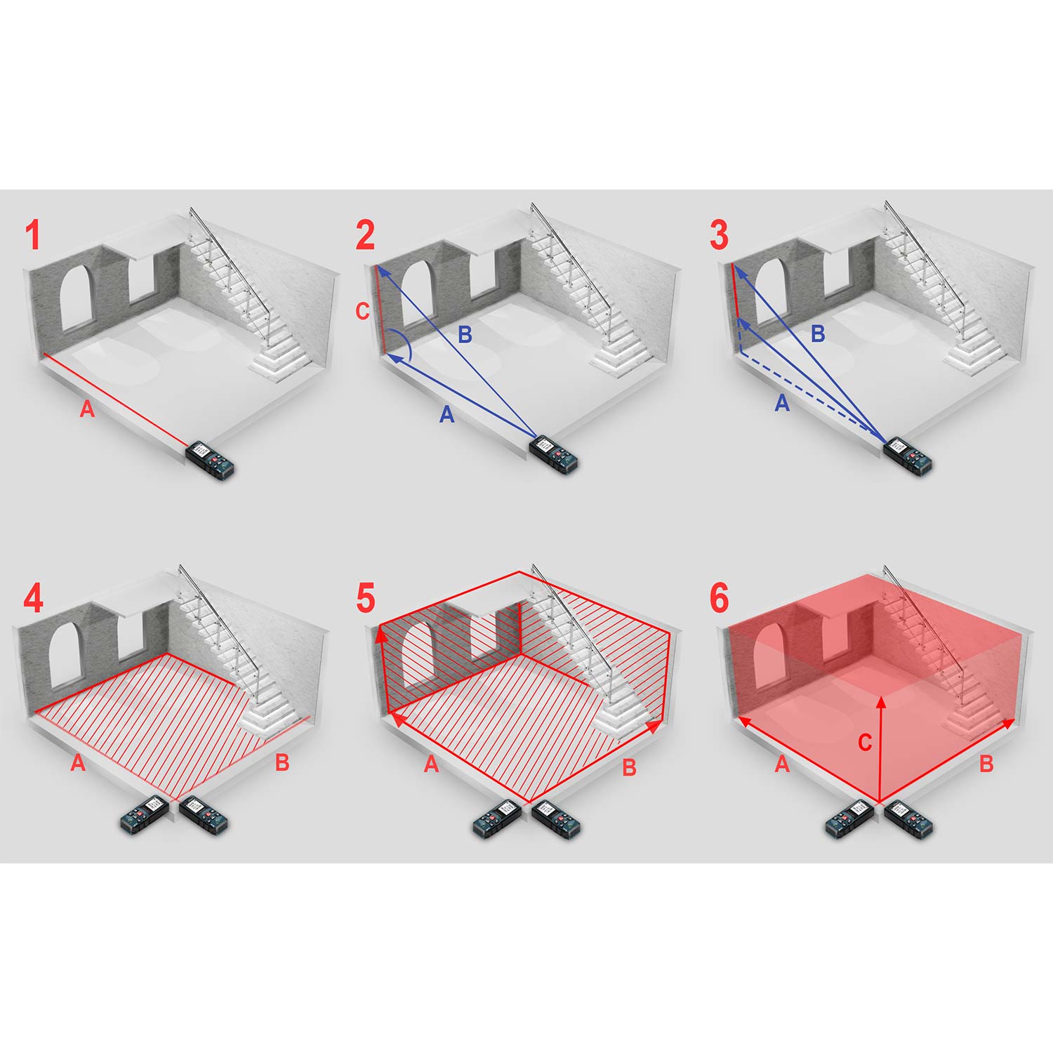 • Funkcje: pomiar odległości, powierzchni, objętości, ciągły pomiar, metoda Pitagorasa, pamięć wyników, poziomica bąbelkowa