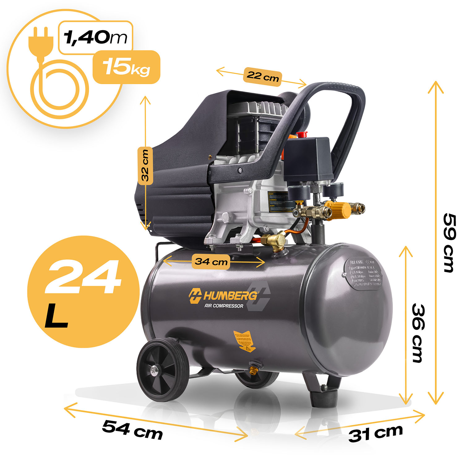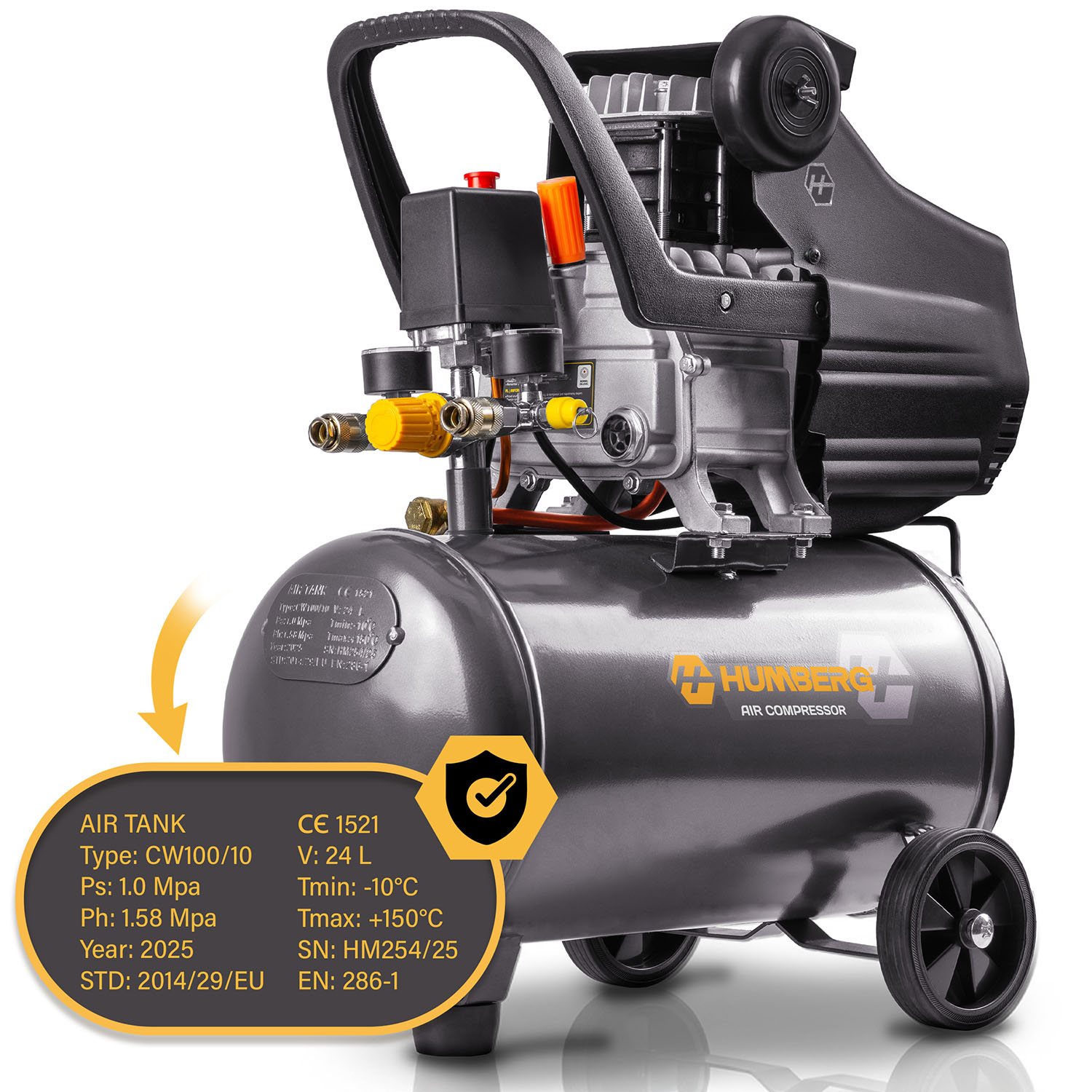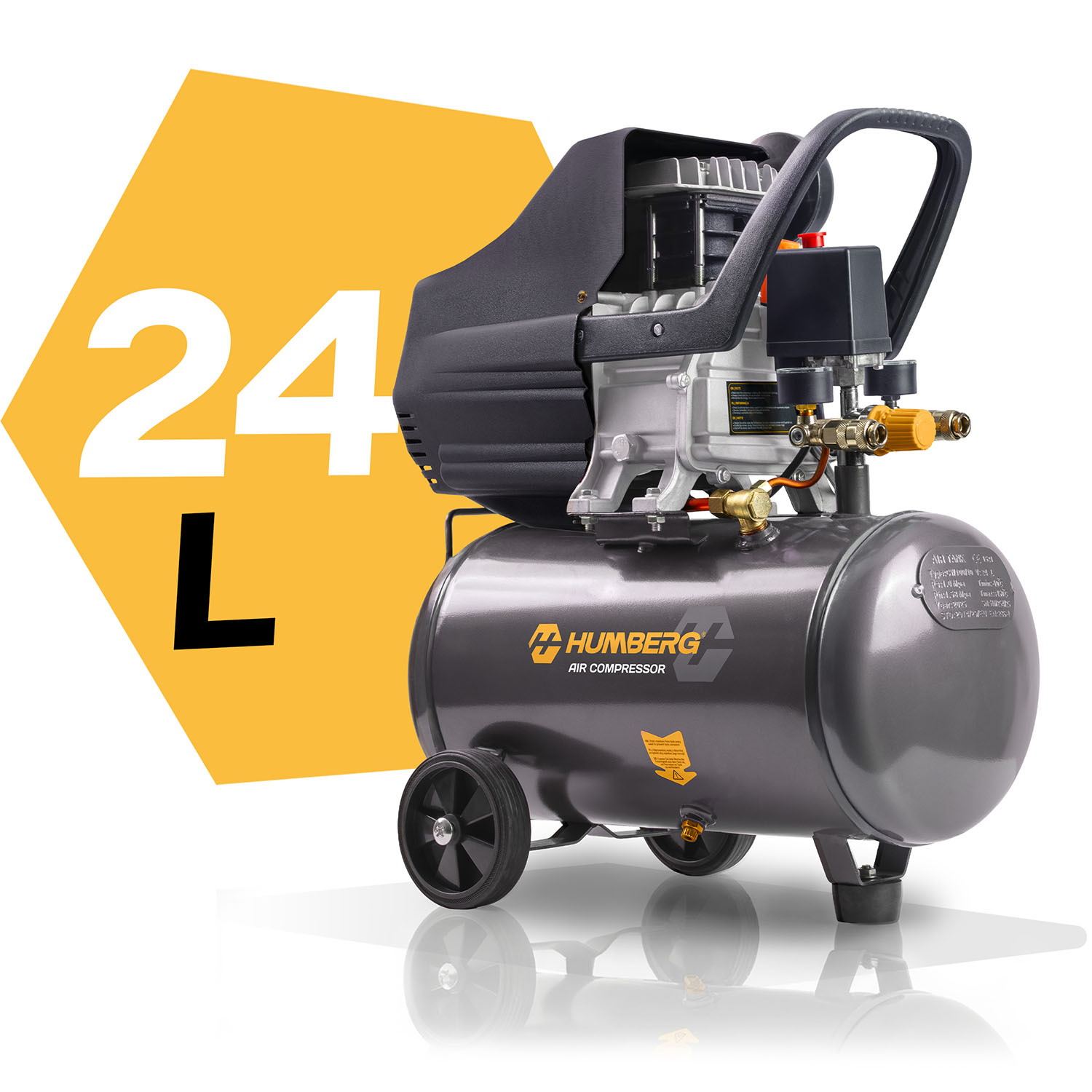 Zaawansowana pompa tłokowa |  Olej 600 ml w zestawie  |  Zbiornik 24 l  |  Wysoka jakość wykonania | Solidne kółka