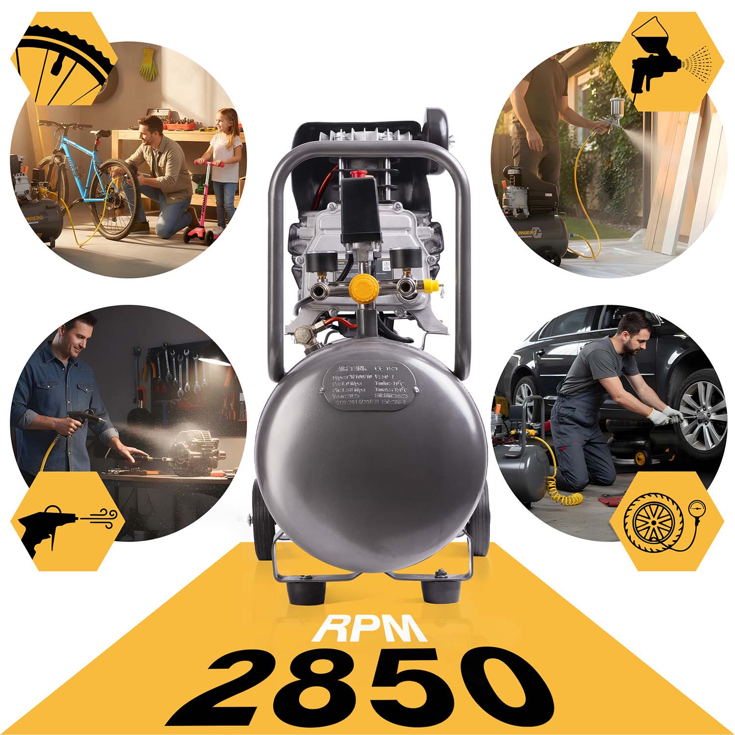 Prędkość obrotowa 2850 obr./min oznacza, że silnik kompresora pracuje szybko i dynamicznie, dzięki czemu sprężarka może efektywnie tłoczyć powietrze i szybciej napełniać zbiornik. Taka wartość obrotów jest typowa dla mocnych, wydajnych urządzeń warsztatowych i przekłada się na stabilną pracę, wysoką wydajność oraz pewne działanie nawet przy bardziej wymagających narzędziach pneumatycznych.