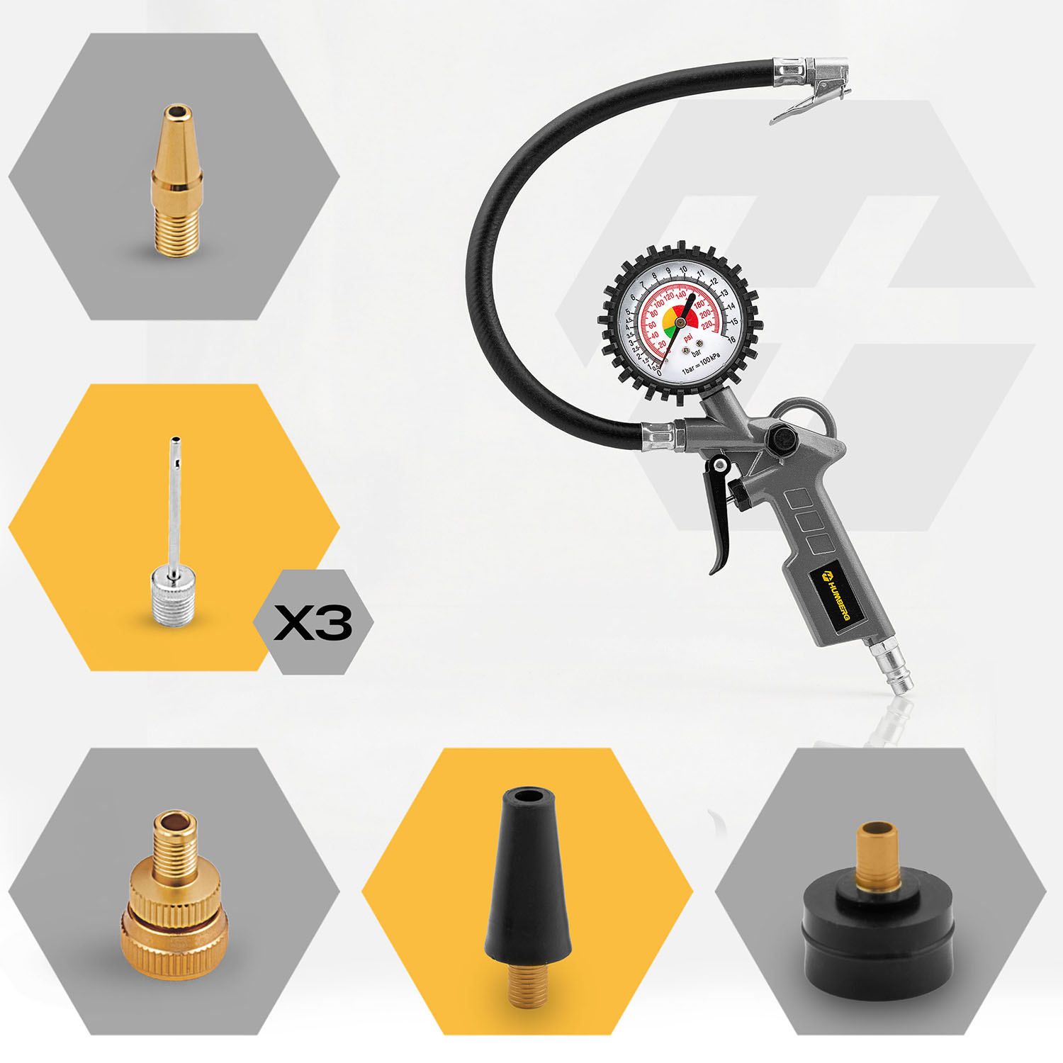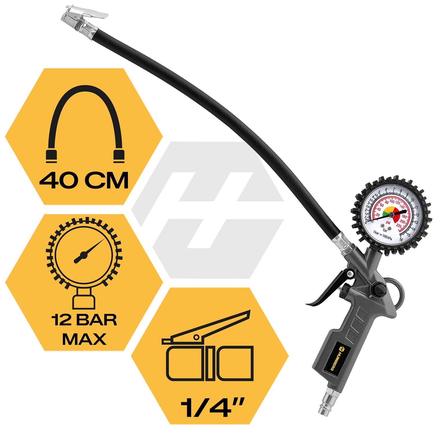To niezastąpione narzędzie do obsługi kompresora! Solidny pistolet do pompowania z manometrem sprawdzi się idealnie zarówno w warsztacie, jak i w garażu. Wyposażony w: