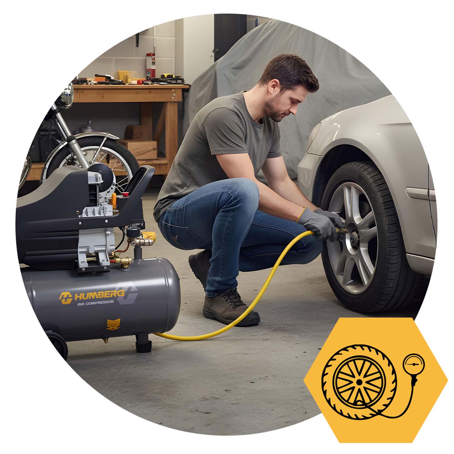 ✅ Manometr do 12 BAR – pozwala na dokładną kontrolę ciśnienia, co zapobiega niedopompowaniu lub przeładowaniu.